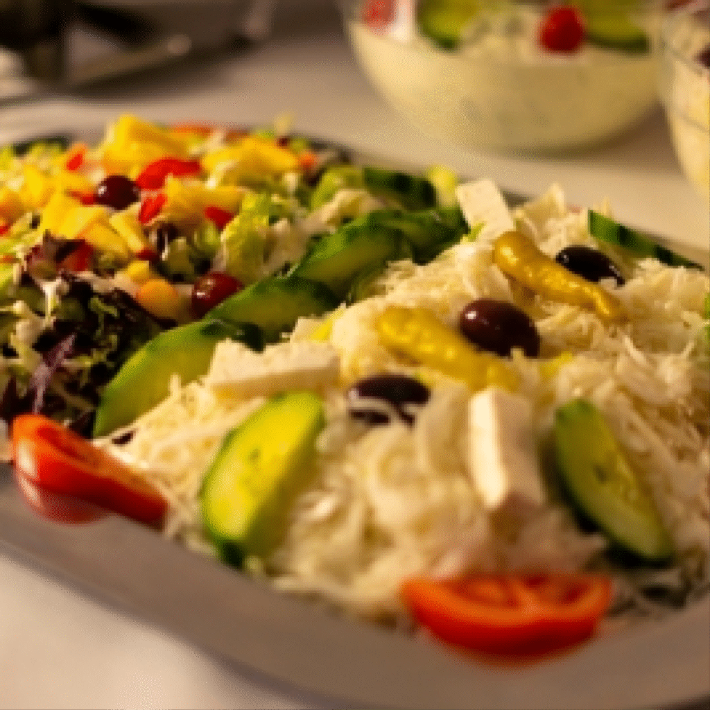 Auf einer Platte serviert: Mischung aus Krautsalat und Eisbergsalat mit hausgemachtem Joghurtdressing. Portion für 1 Person.